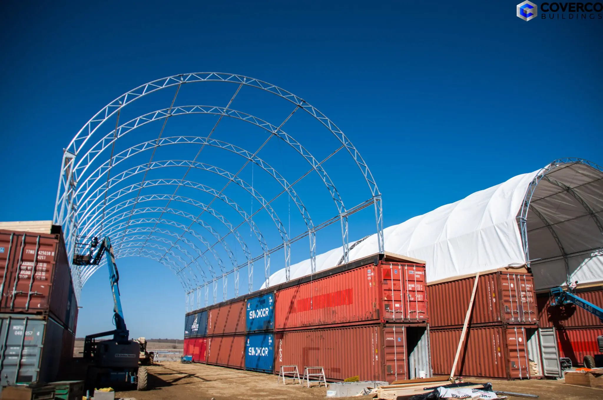 Two custom Calhoun CC-Series buildings were designed and engineered for KNM on a 2 row-high sea container foundations, with custom 25’ x 28’ door openings and 28’ high side walls to accommodate the vessels. The custom job gave KNM the affordable height they needed, while offering additional storage they were looking for nearby in the sea containers.