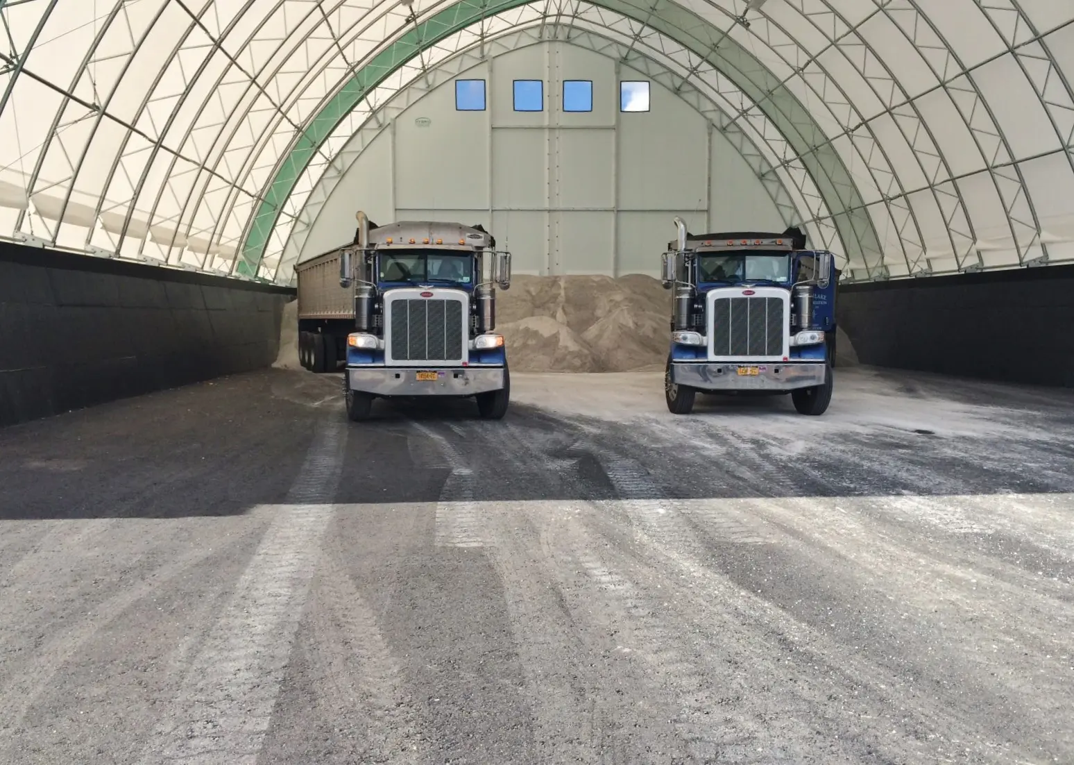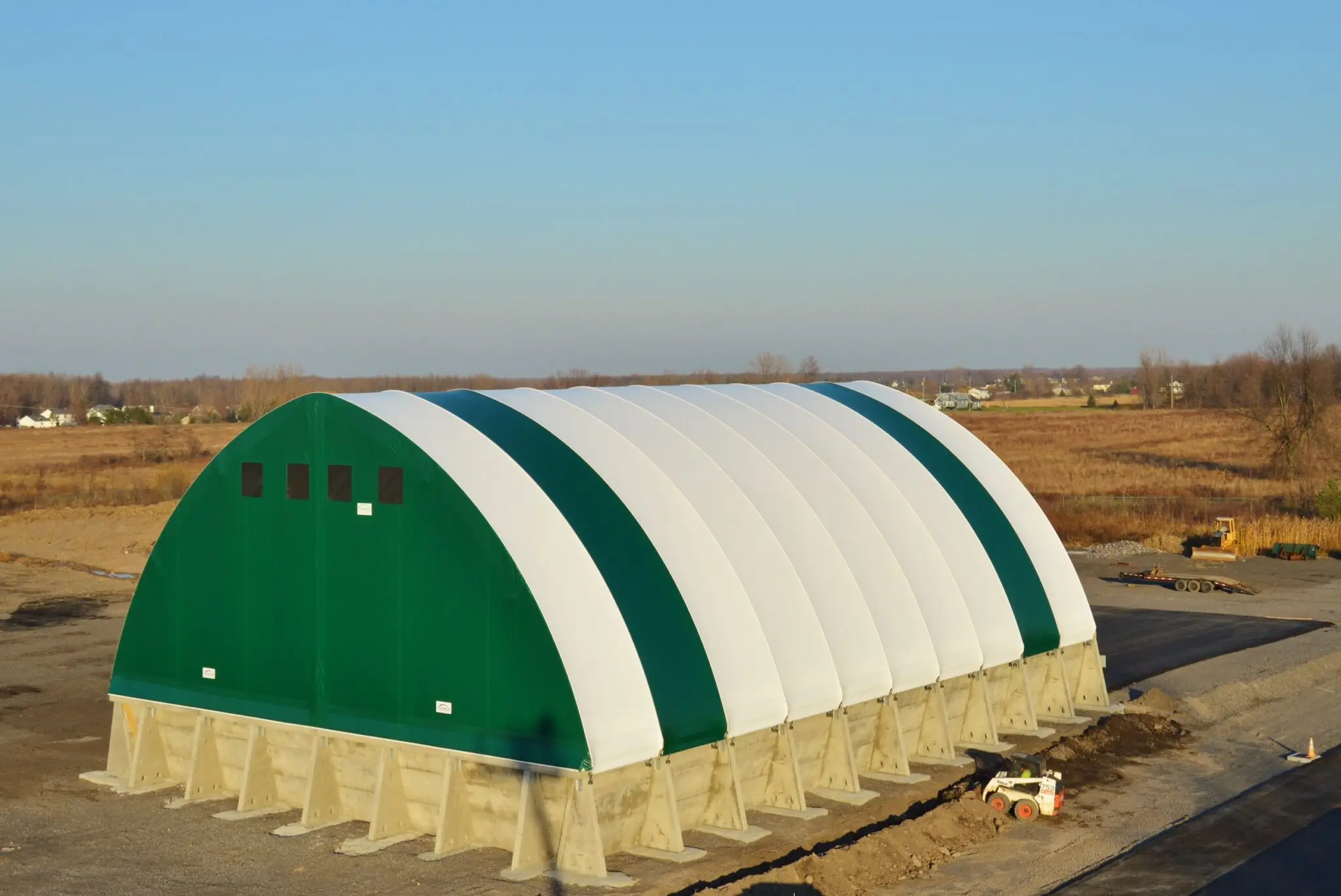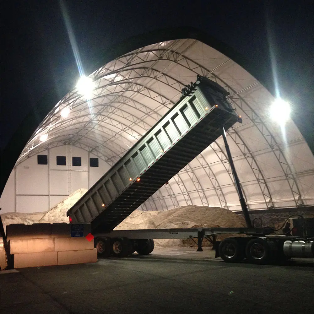 Ce robuste bâtiment de stockage de sel de 72 x 100 HT Series toile structure a été construit en quelques jours et à temps pour la saison hivernale. Les fondations et les murs en béton constituent une solution durable et respectueuse de l'environnement pour le stockage du sel. Grâce à la hauteur supplémentaire de la série HT, plus d'un camion peut facilement livrer du sel dans la structure, ce qui maximise la quantité de sel qui peut être stockée en toute sécurité. Outre les économies réalisées par rapport aux bâtiments à ossature en acier ou en bois, les coûts d'éclairage sont également minimisés car la couverture toile permet d'utiliser la lumière naturelle pendant la journée.